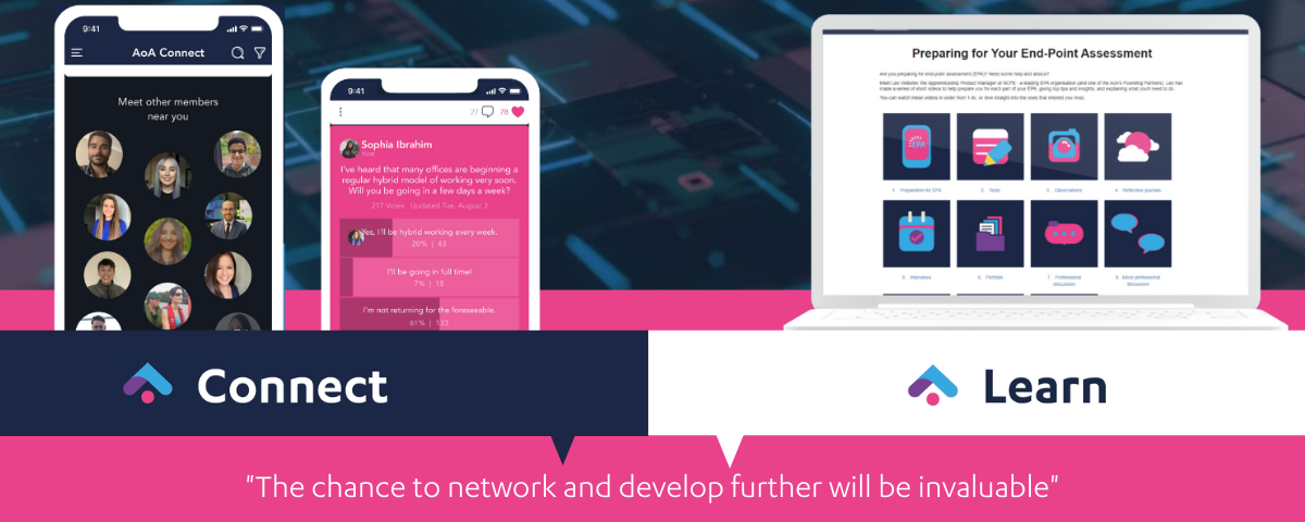 AoA Connect is a bespoke social and professional networking platform that allows you to unite with peers in a dedicated, inclusive virtual community. Here you can chat, discuss, and gain insight from apprentices across the country on the same programme, in the same industry, in the same region or in any group of interest to you. AoA Connect is available at your fingertips as an app to ensure that you always have real-time access.